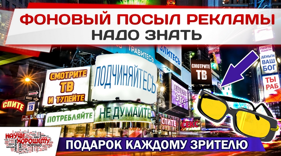 Поэтому призываем наших зрителей убрать из дома телевизор, в интернете использовать программное обеспечение, блокирующее рекламу, почаще надевать подаренные вам очки, чтобы видеть суть вещей и процессов, и активно распространять этот видеоролик. Чем большему количеству друзей вы подарите эти очки, тем быстрее изменится ваше окружение и мир в целом.