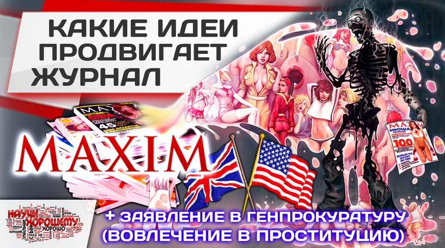 По этой причине проектами Научи хорошему и Политическая практика было подготовлено заявление в Генеральную прокуратуру по журналу Maxim. В заявлении в частности указано, что на территории Российской Федерации ведётся системная деятельность по искусственному сокращению населения России через последовательное уничтожение института семьи, путём пропаганды распущенности, праздного образа жизни и культа внешности, в котором женская красота представляется потребительским товаром.